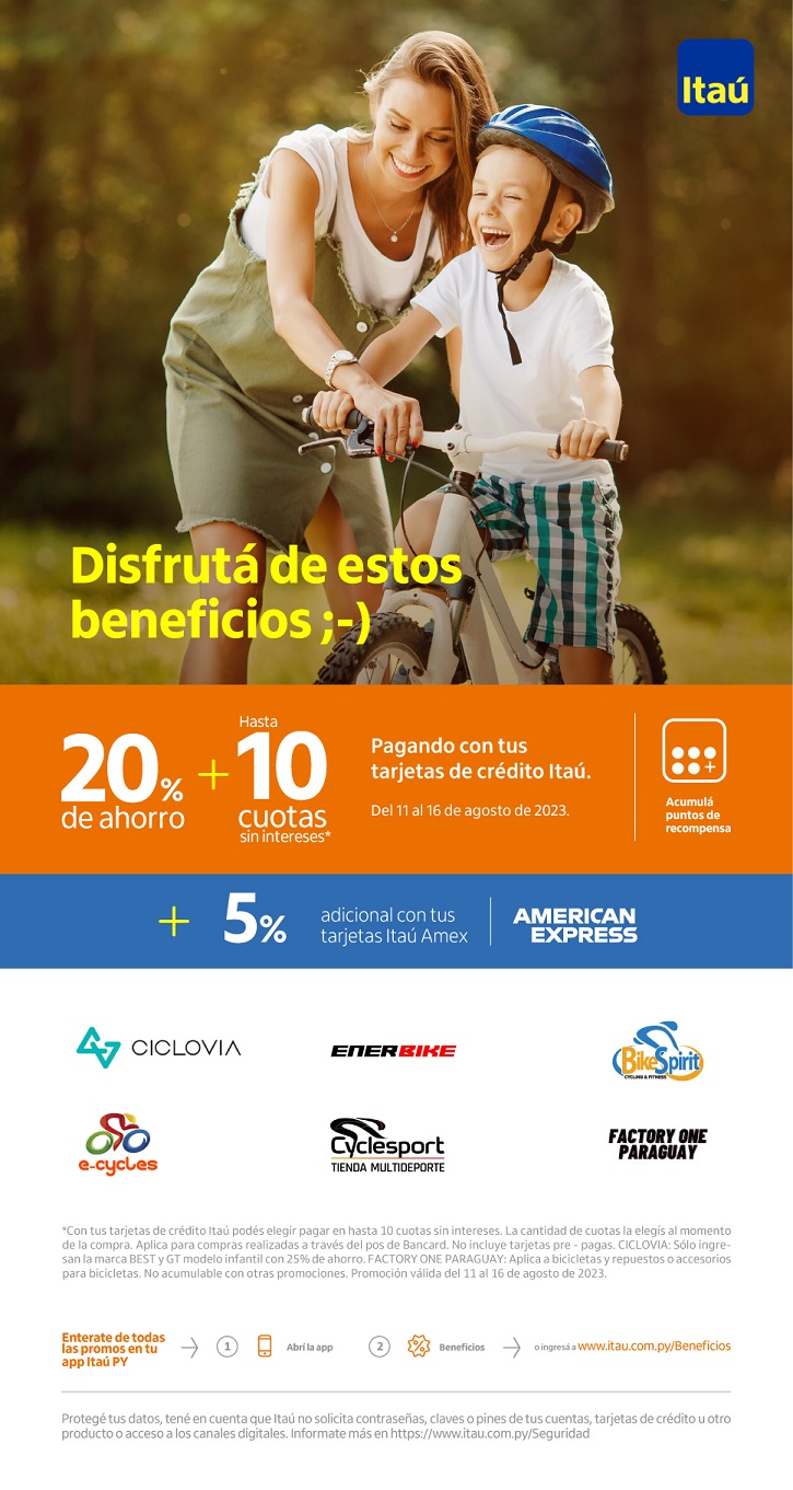 Con tus tarjetas de crédito Itaú tenés 20% de ahorro +5% adicional pagando con tus tarjetas Itaú AMEX. Podés elegir pagar en hasta 10 cuotas sin intereses. La cantidad de cuotas la elegís al momento de la compra. Aplica para compras realizadas a través del pos de Bancard. No incluye tarjetas pre - pagas. CICLOVIA: Sólo ingresan la marca BEST y GT modelo infantil con 25% de ahorro. FACTORY ONE PARAGUAY: Aplica a bicicletas y repuestos o accesorios para bicicletas. No acumulable con otras promociones. Promoción válida del 11 al 16 de agosto de 2023