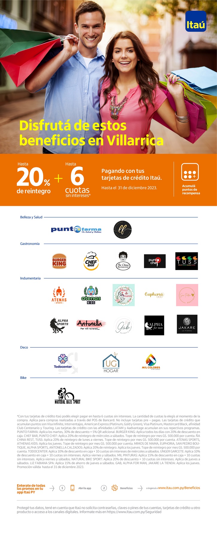 *Con tus tarjetas de crédito Itaú podés elegir pagar en hasta 6 cuotas sin intereses. La cantidad de cuotas la elegís al momento de la compra. Aplica para compras realizadas a través del POS de Bancard. No incluye tarjetas pre – pagas. Las tarjetas de crédito que acumulan puntos son Visa Infinite, Interventajas, American Express (Platinum, Gold y Green), Visa Platinum, Mastercard Black, afinidad Club Centenario y Touring. Las tarjetas de crédito con las afinidades LATAM y Aadvantage acumulan en sus repectivos programas. PUNTO FARMA: Aplica los martes, 30% de descuento + 5% QR adicional. BURGER KING: Aplica todos los días con 20% de descuento en caja. CHEF BAR, PUNTO CHEF: Aplica 20% de reintegro de miércoles a sábados. Tope de reintegro por mes GS. 500.000 por cuenta. ÑA CHINA REST, TUSS: Aplica 20% de reintegro de lunes a viernes. Tope de reintegro por mes GS. 500.000 por cuenta. ATENAS SPORTS, ATHENAS KIDS: Aplica los jueves. Tope de reintegro por mes GS. 500.000 por cuenta. MIMOS DE MAMA, EUPHORIA, SAN PEDRO BOUTIQUE, ALPHA SPORTS, ANTONELLA CALZADOS: Aplica 20% de reintegro. Aplica los jueves. Tope de reintegro por mes GS. 500.000 por cuenta. TODOCENTER: Aplica 10% de descuento en caja + 10 cuotas sin intereses de miércoles a sábados. UNGER GARCETE: Aplica 10% de descuento en caja + 10 cuotas sin intereses. Aplica viernes y sábados. MIL PINTURAS: Aplica 15% de descuento en caja + 10 cuotas sin intereses. Aplica viernes y sábados. NATURAL BIKE SPORT: Aplica 20% de descuento + 10 cuotas sin intereses. Aplica de jueves a sábados. Promoción válida del 7 de febrero hasta el 31 de diciembre 2023.