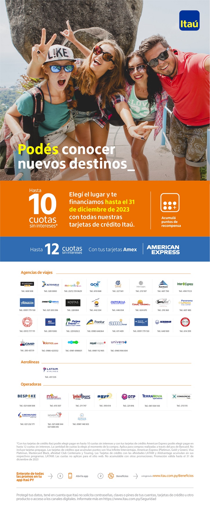 *Con tus tarjetas de crédito Itaú podés elegir pagar en hasta 10 cuotas sin intereses y con tus tarjetas de crédito American Express podés elegir pagar en 12 cuotas sin intereses. La cantidad de cuotas la elegís al momento de la compra. Aplica para compras realizadas a través del pos de Bancard. No incluye tarjetas pre – pagas. Las tarjetas de crédito que acumulan puntos son Visa Infinite, Interventajas, American Express (Platinum, Gold y Green), Visa Platinum, MasterCard Black, afinidad Club Centenario y Touring. Las tarjetas de crédito con las afinidades LATAM y Aadvantage acumulan en sus respectivos programas. No acumulable con otras promociones. Promoción válida hasta el 31 de diciembre de 2023.