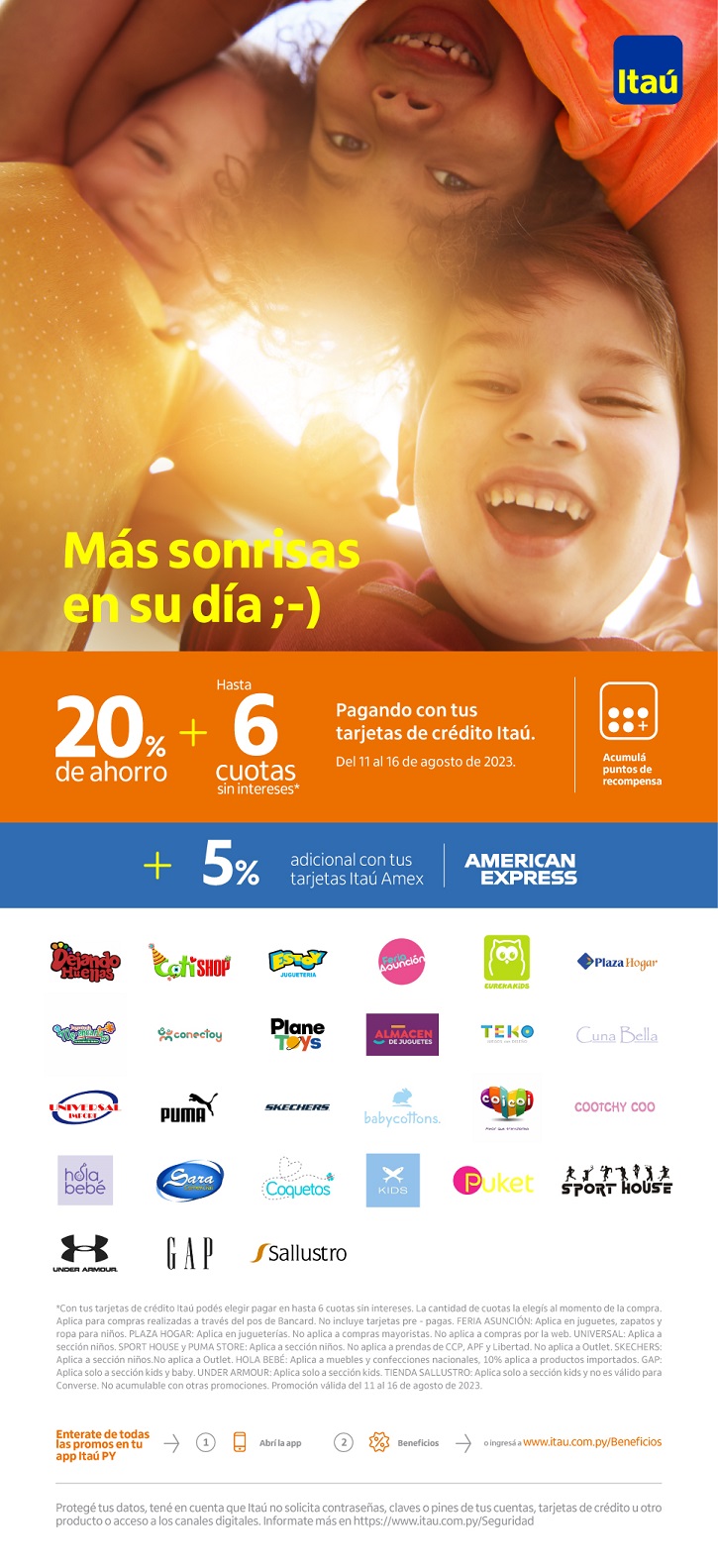Con tus tarjetas de crédito Itaú tenés 20% de ahorro y 5% adicional pagando con tus tarjetas Itaú AMEX. Podés elegir pagar en hasta 6 cuotas sin intereses. La cantidad de cuotas la elegís al momento de la compra.