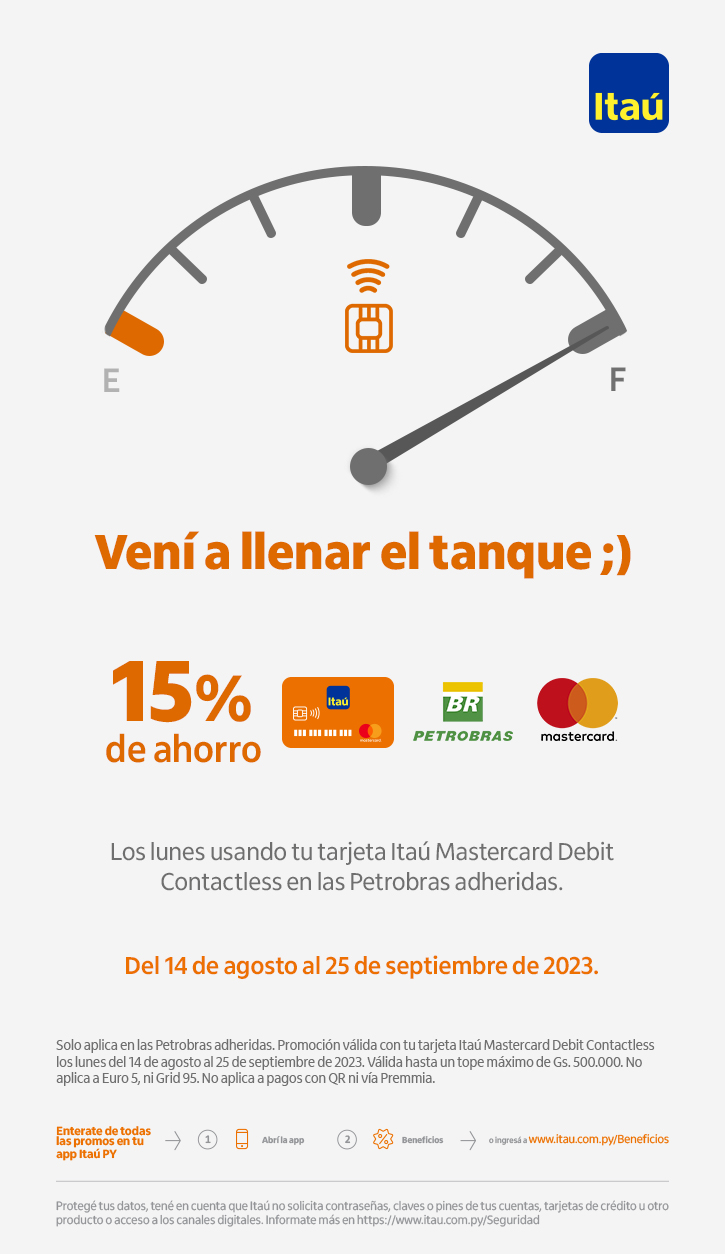 Del 14 de agosto al 25 de septiembre de 2023 pagando con tu tarjeta Itaú Mastercard Debit Contactless tenés 15% de ahorro en estaciones adheridas.