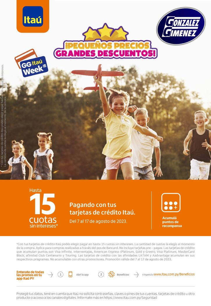 *Con tus tarjetas de crédito Itaú podés elegir pagar en hasta 15 cuotas sin intereses. La cantidad de cuotas la elegís al momento de la compra. Aplica para compras realizadas a través del pos de Bancard. No incluye tarjetas pre – pagas. Las tarjetas de crédito que acumulan puntos son Visa Infinite, Interventajas, American Express (Platinum, Gold y Green), Visa Platinum, MasterCard Black, afinidad Club Centenario y Touring. Las tarjetas de crédito con las afinidades LATAM y Aadvantage acumulan en sus respectivos programas. No acumulable con otras promociones. Promoción válida del 7 al 17 de agosto de 2023.